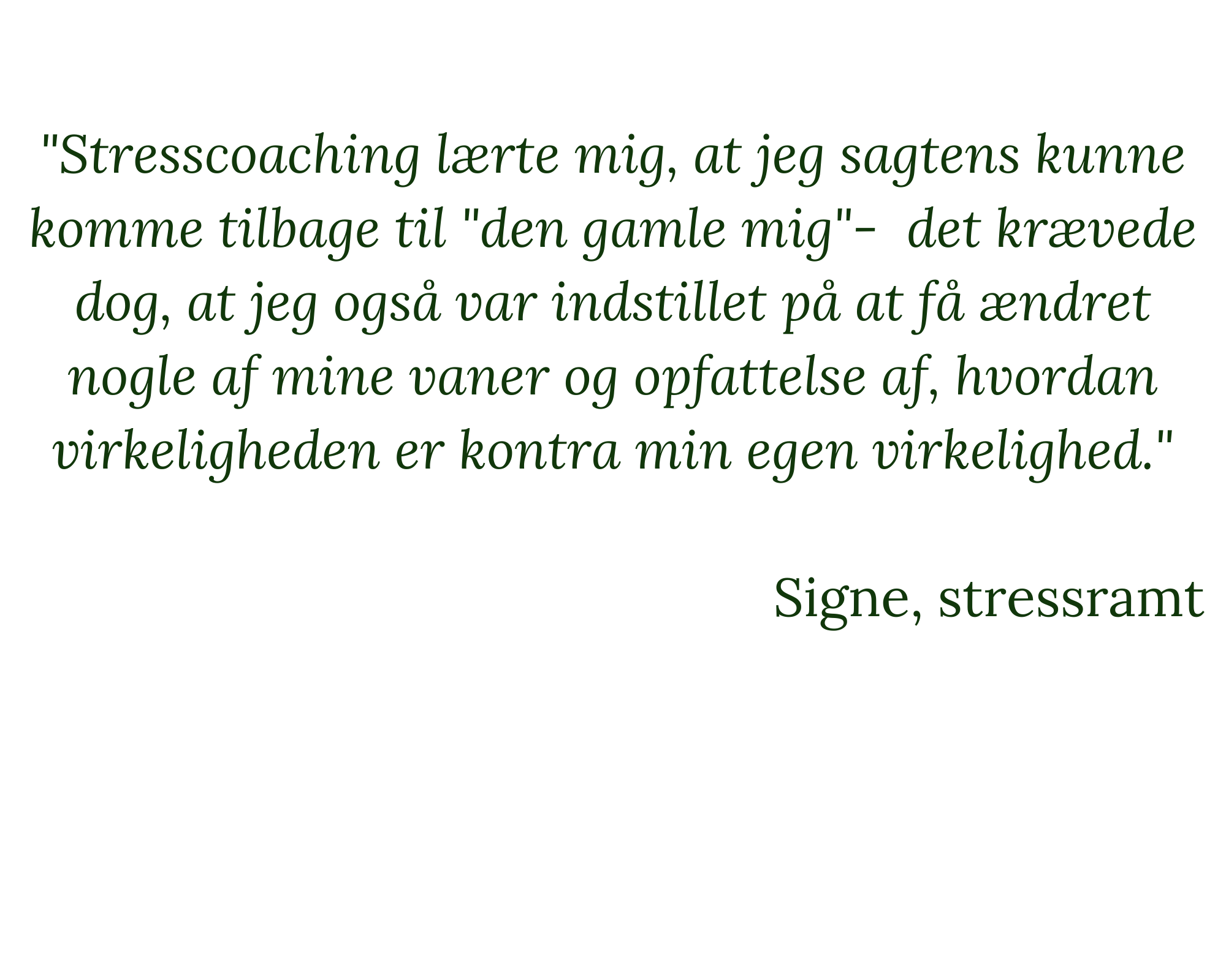 - Coaching – der arbejdes med konkrete problemstillinger fx. vaner/holdninger, herunder, kontrol, for mange bolde i luften m.fl.